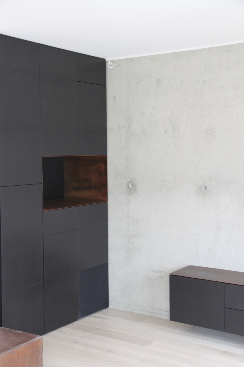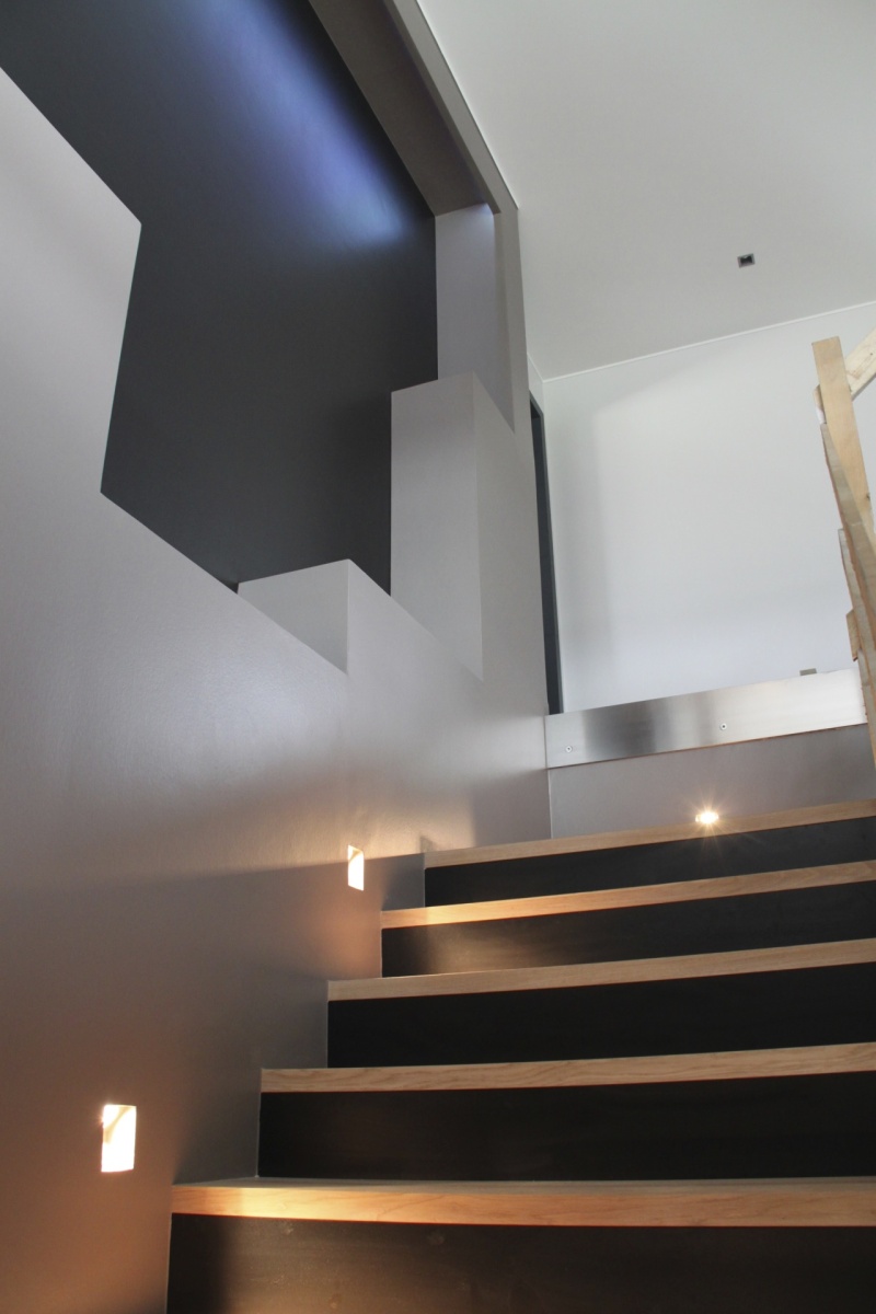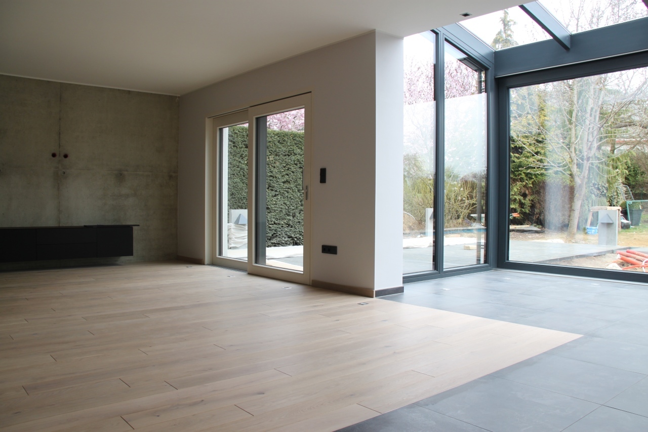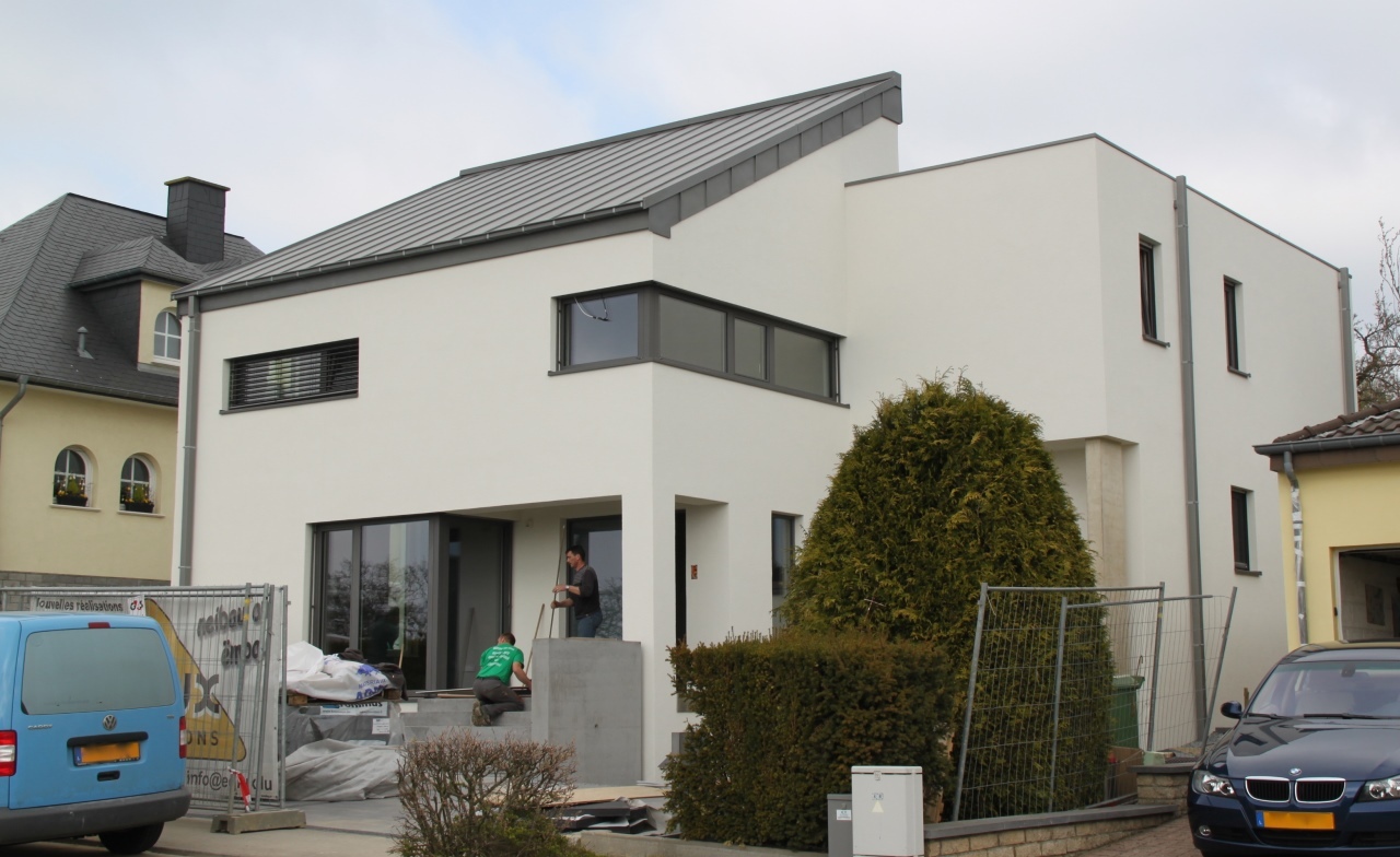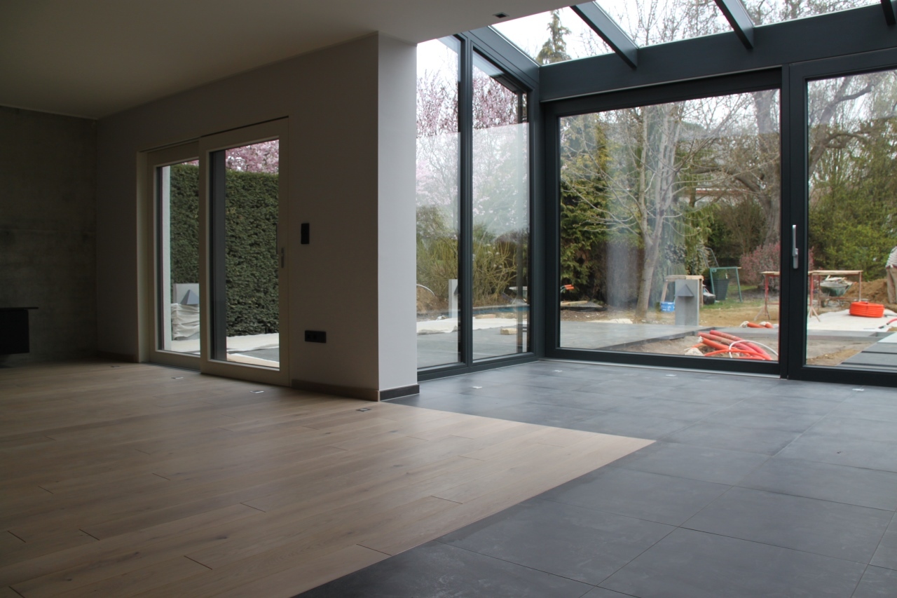 Transformation complète d'une maison unifamiliale. Les travaux comprennent une extension sur la face avant et la construction d'un étage plein au lieu de la toiture existante. Les cloisons du rez-de-chaussée disparaissent pour créer des espaces ouverts et aérés. La démolition de la toiture et la construction d'un étage plein engendre des chambres très spacieuses ainsi que des espaces communs (jeux, TV).