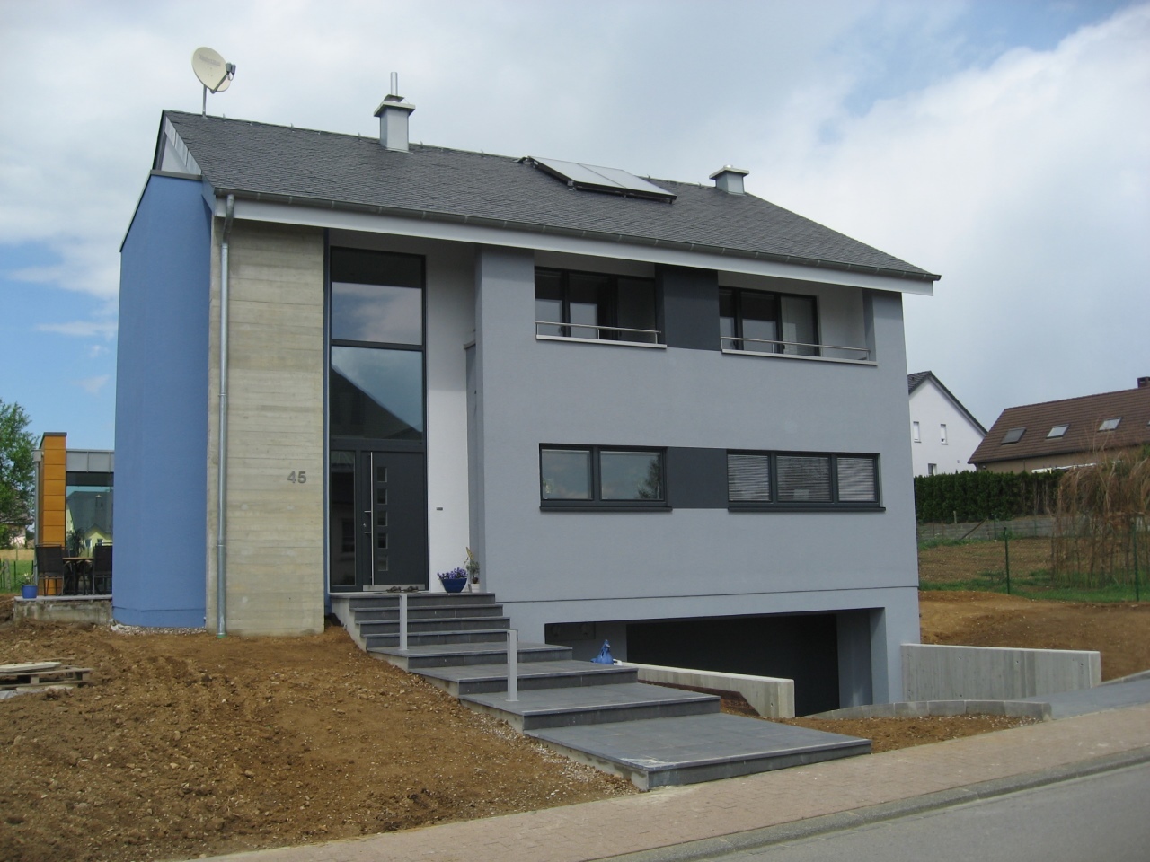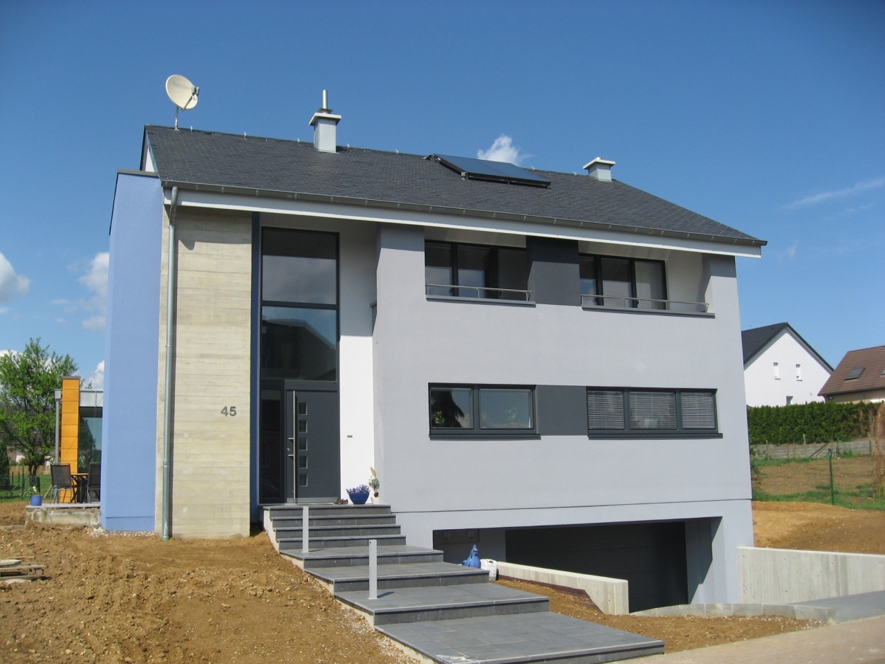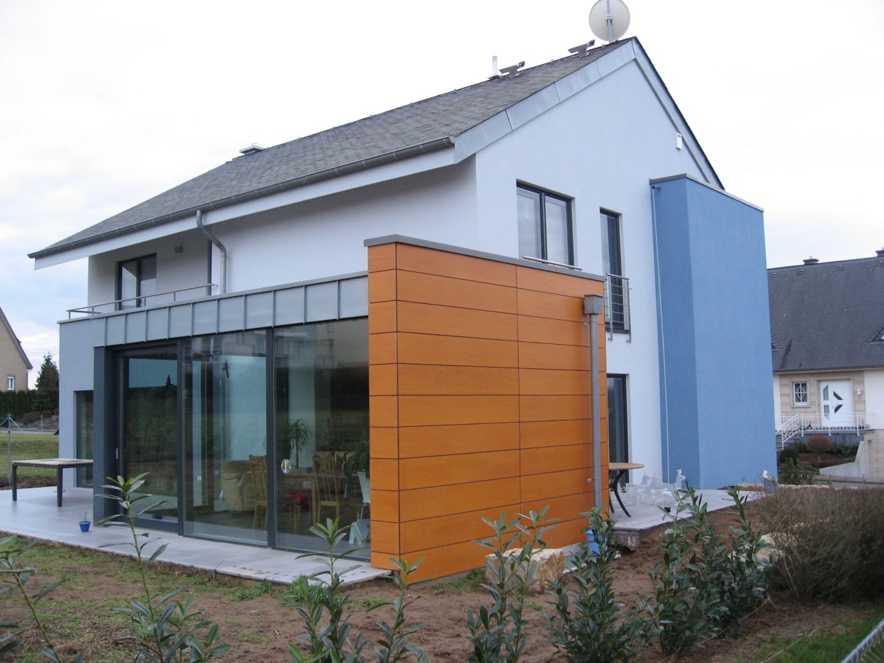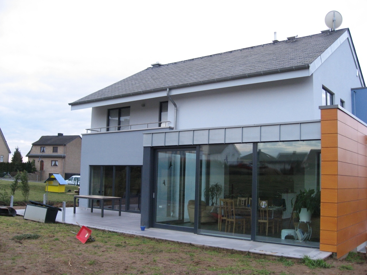 Il s’agit de notre première maison basse énergie et en ossature bois du bureau. Le rez-de-chaussée comprend les pièces de séjour et est complètement ouvert, tandis que les chambres se trouvent à l'étage, protégés du soleil d'été par de larges débords de toiture.