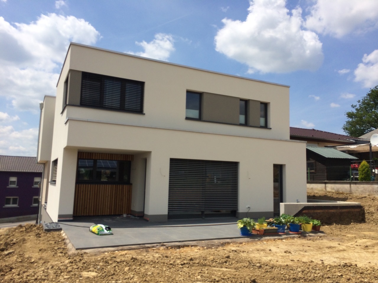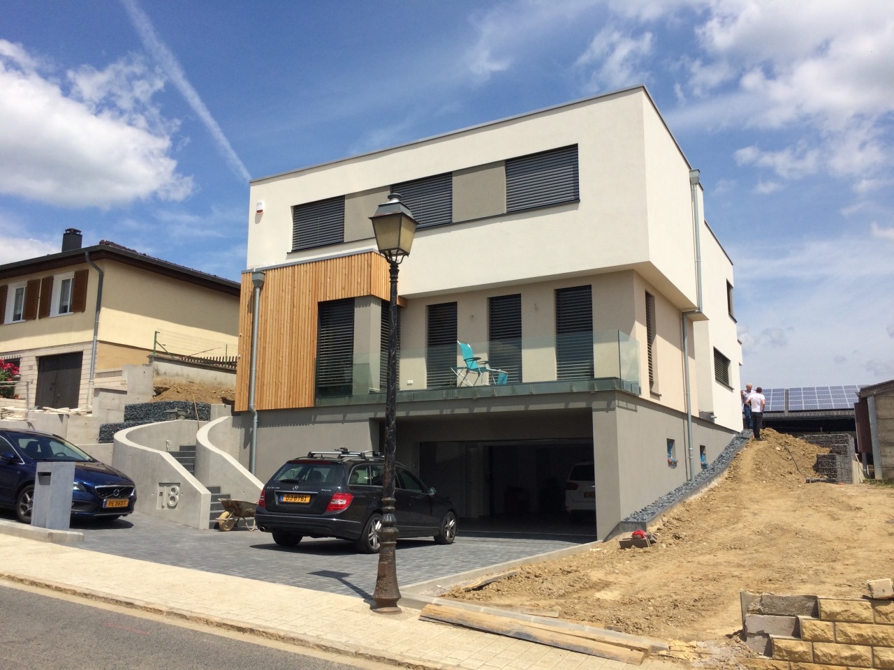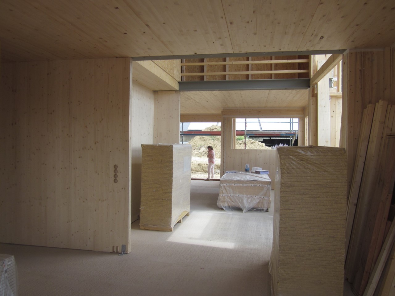 Maison unifamiliale passive (Classe AAA), en bois massif. Le rez-de-chaussée comprend un petit bureau et le séjour donnant sur un petit balcon du côté rue (ouest). La cuisine / salle à manger est orientée vers le jardin à l'est et est ouverte sur le séjour. A l'étage une bibliothèque en mezzanine donne sur le séjour et une grande baie vitrée au sud. Trois chambres pour enfants et la chambre des parents sont disposées autour de la mezzanine.
